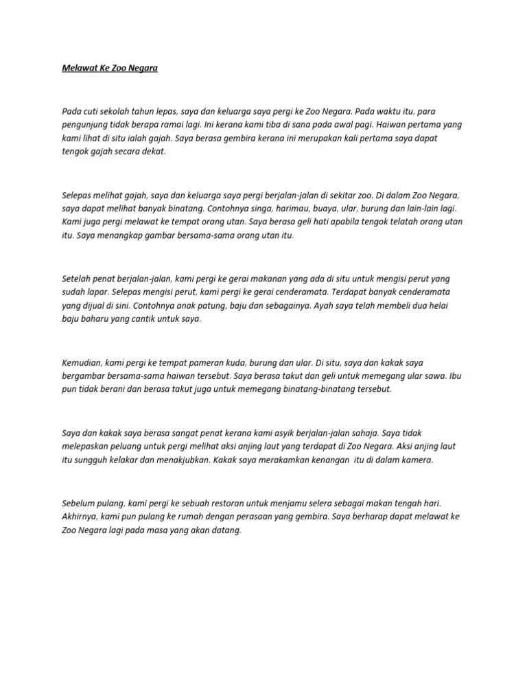 Pada cuti sekolah yang lalu, bapa membawa kami sekeluarga melawat ke zoo negara yang terletak di kuala lumpur. Pada cuti sekolah yang lepas, saya dan keluarga pergi ke. Kami bertolak ke sana pada pukul 8.00 pagi dengan menaiki kereta bapa. Kami bertolak ke sana pada . Karangan upsr laporan lawatan ke zoo negara pada cuti sekolah yang lalu, bapa membawa kami sekeluarga pergi ke zoo negara. Pada cuti ______ yang lalu, bapa membawa kami. Kami ke sana dengan menaiki kereta ayah.